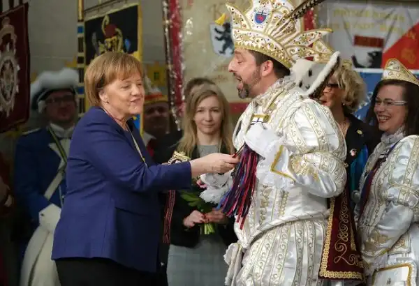 2. Канцлер Германии Ангела Меркель, шутя, пытается отнять праздничный жезл у принца Масленицы, 2000-е