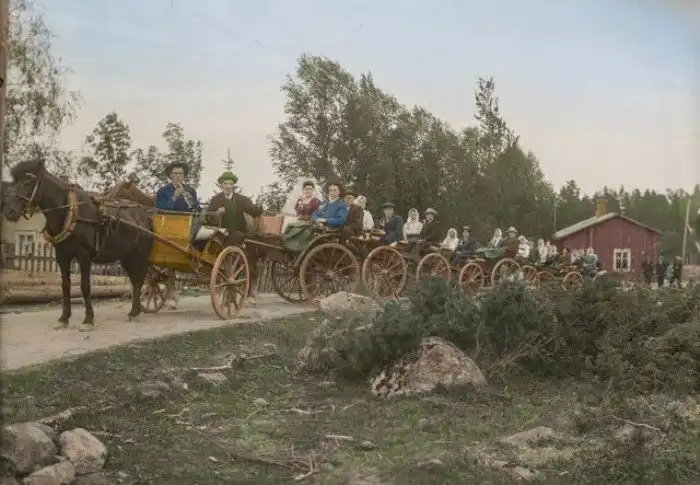 Традиционный свадебный кортеж по дороге в церковь, Остроботния, 1913 г.