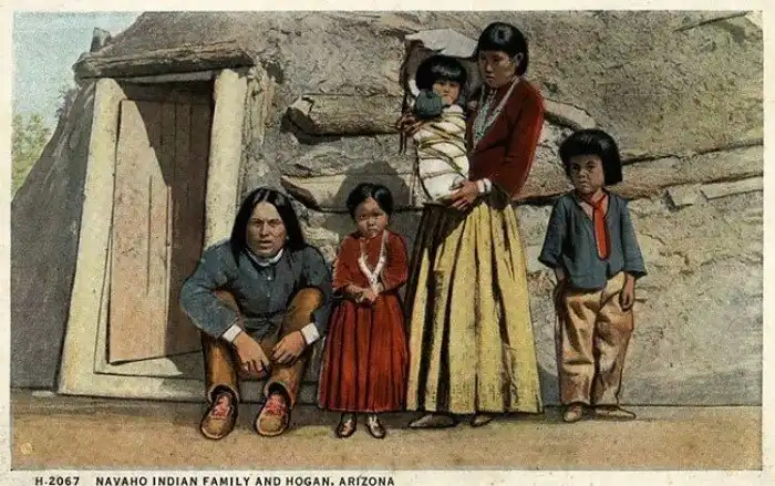 Семья навахо на фоне традиционного жилища хоган, 1915