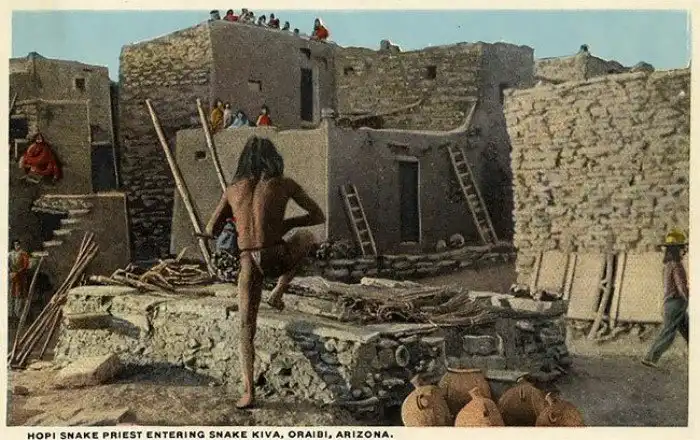 Священнослужитель хопи заходит в киву, Ораиби, Аризона, 1920