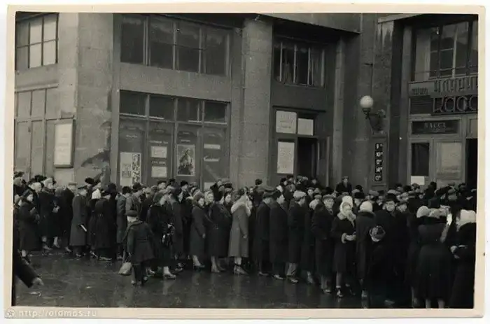 Но и приобщиться к культуре иногда можно исключительно через очередь. Кинотеатр «Ударник». Очередь за билетами. 1948 год.