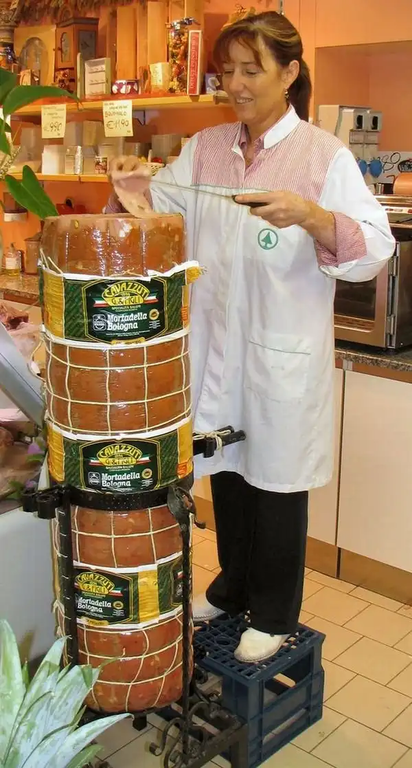 Гигантская колбаса Mortadella. Не совсем понял, то ли это ради какого то конкурса ее делают, то ли постоянный есть такой вариант: