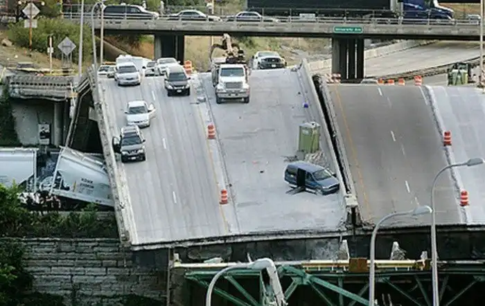 Из-за устаревшей конструкции часть моста автострады разрушилась в час пик, в результате чего несколько машин съехали в реку Миссисипи. 13 человек погибло, еще 145 получили ранения.