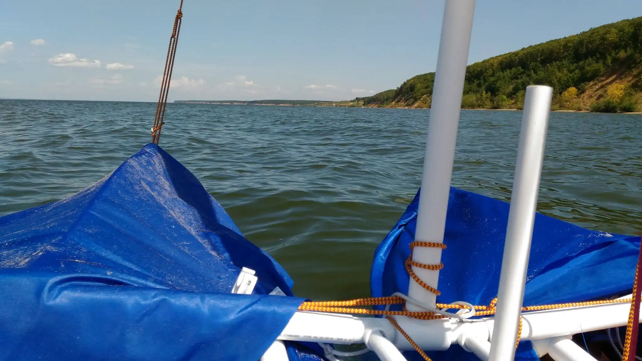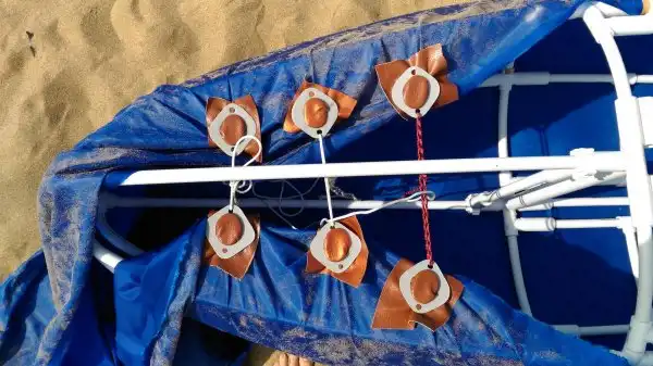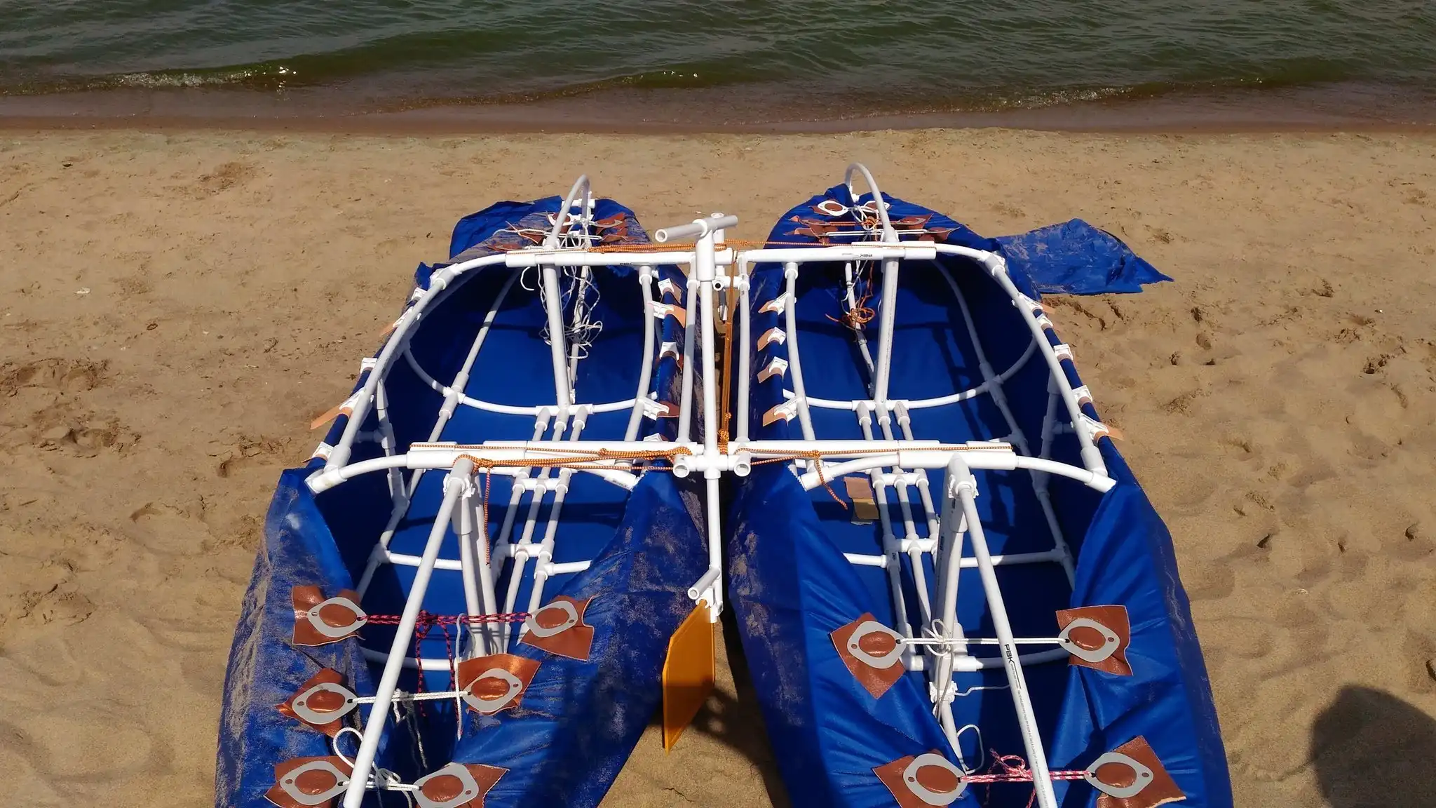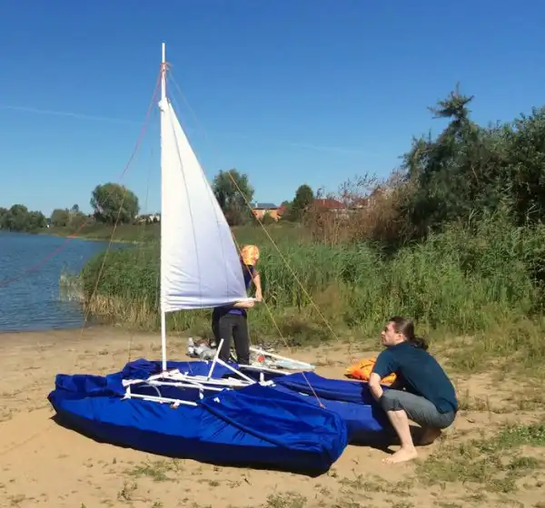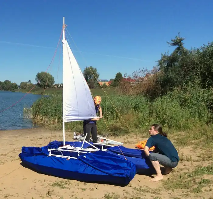 На каркас натягивается водонепроницаемая ткань. Две части собираются с помощью тех же труб. Естественно, нужно добавить руль.