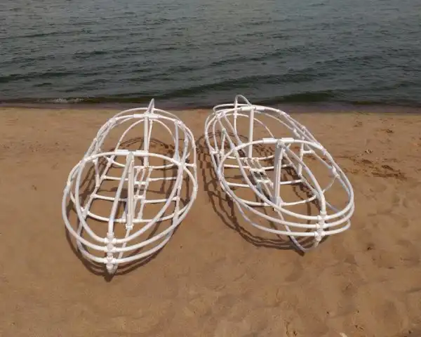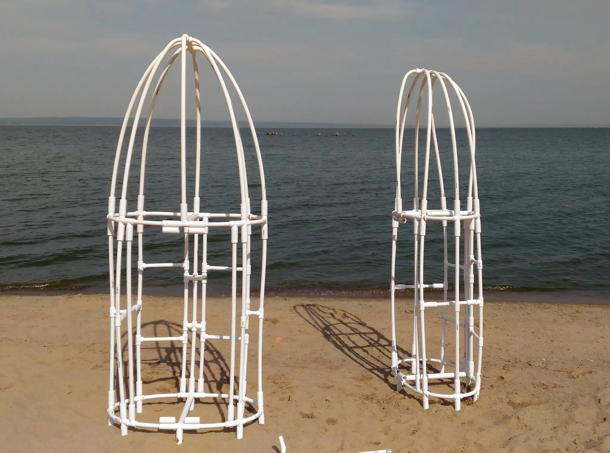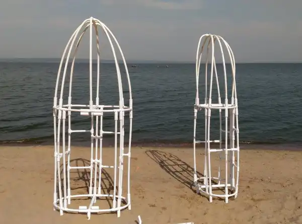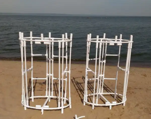 Из полипропиленовых труб собираются два каркаса. Трубы нужно разрезать, а затем согнуть в нужных местах с помощью строительного фена. Он нагревает пластик, делая его мягким.