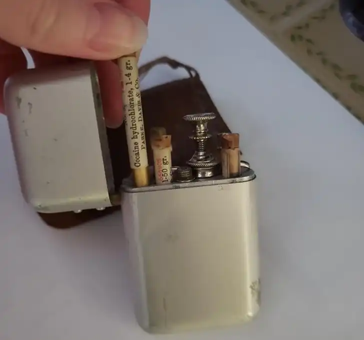 Набор медсестры столетней давности, в котором находится шприц и таблетка кокаина