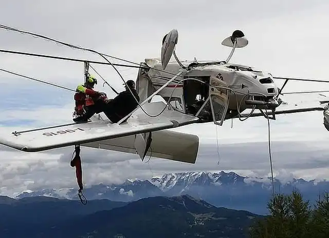 Легкомоторный самолет врезался в подъемник и запутался в кабелях, в результате чего 62-летний пилот и 55-летний пассажир повисли вверх ногами. Спасателям понадобилось около полутора часов, чтобы освободить пожилых искателей приключений. Как отметили спасатели, 2 мужчинам крупно повезло, что самолет не упал, а завис.