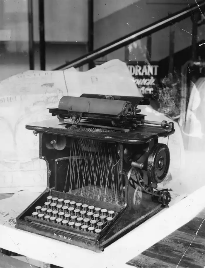 Один из первых прототипов пишущей машинки, созданный в 1866 году. Он был предшественником первой практической, коммерческой машинки, запатентованной в 1868 году К. Л. Шолсом. Снимок сделан в 1923 г.