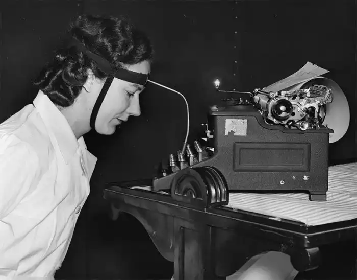 Женщина-инвалид печатает с помощью устройства, прикрепленного к голове, на выставке устройств для инвалидов в Лондоне, 1951 г.