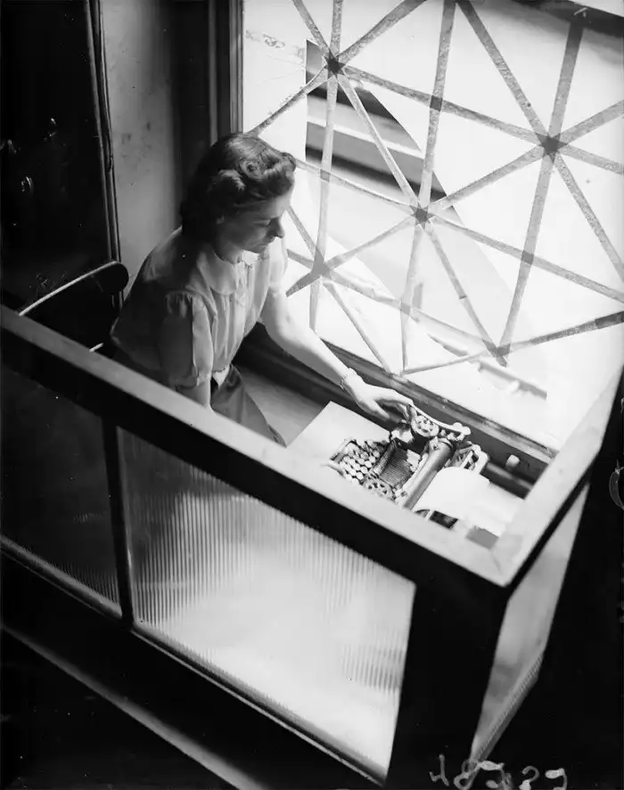 Женщина печатает, сидя у заклеенного крест-накрест окна. Лондон, 1940 г.