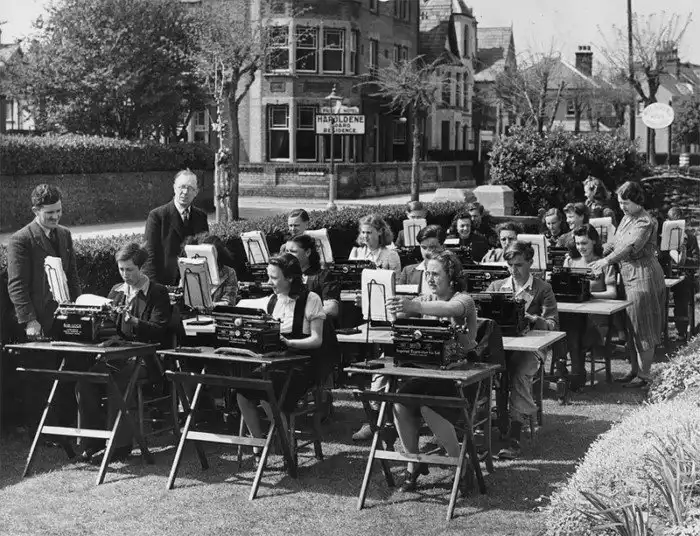 Урок машинописи на открытом воздухе. Клактон, популярное место для эвакуированных из Лондона во время Второй мировой войны. 9 мая 1940 г.