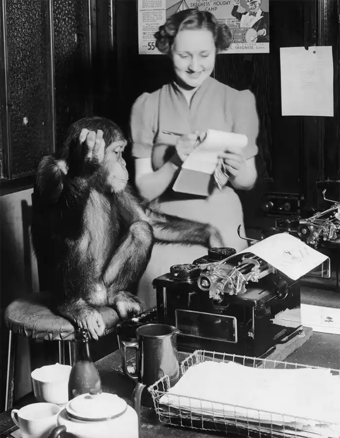 Секретарь на ярмарке развлечений в Скегнессе с шимпанзе по кличке Того, 22 мая 1937 г.