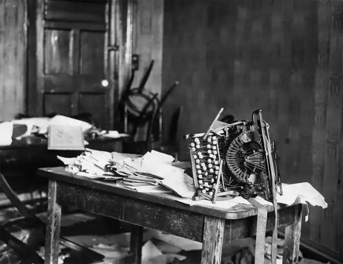 Интерьер таможни в Дублине после того, как там побывала бригада Ирландской республиканской армии, апрель 1921 г.