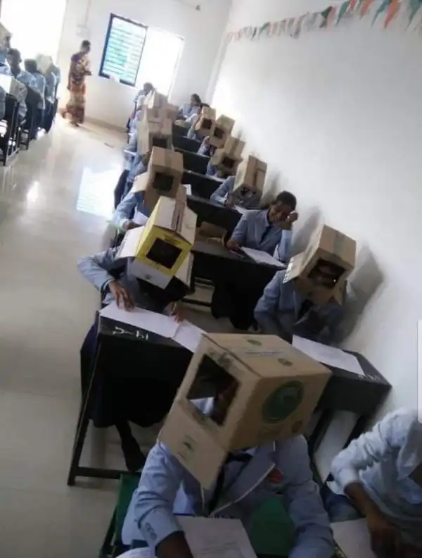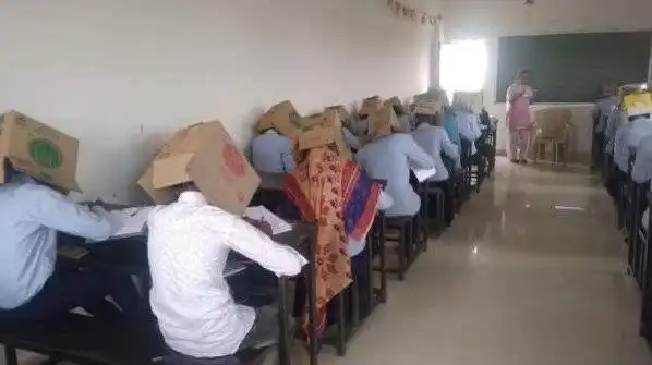 В Индии студентов колледжа заставили надеть коробки на головы, чтобы они не списывали на экзамене