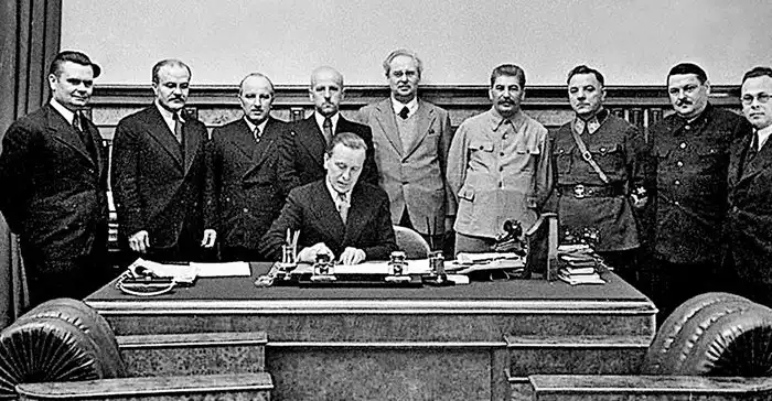 Подписание министром иностранных дел Литвы Ю. Урбшисом советско-литовского договора о передаче Литовской республике города Вильно и Виленской области. Фото. 1939. Сталин 4 справа
