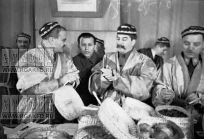 В.М.Молотов (слеава), И.В.Сталин, К.Е.Ворошилов (на первом плане), А.И.Микоян, В.Я.Чубарь (на дальнем плане) в национальных костюмах на совещании хлопкоробов Таджикистана и Туркменистана