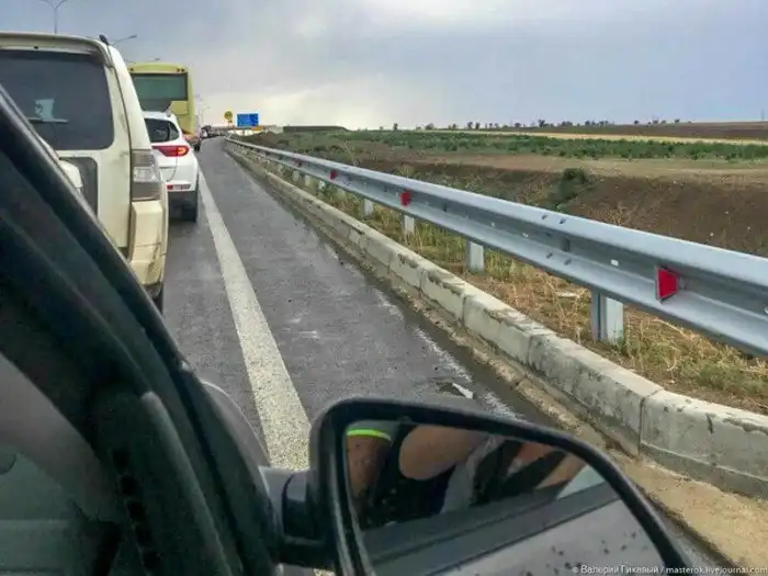 Думал, что на территории Крыма хотя бы уже почти все сделано, но нет. Трасса скорее всего построена на много процентов уже и это видно, но движение до Симферополя осуществляется только по одной из полос попеременно. Второе направление видно что готово, но из-за неготовности связующих элементов еще не запущено. В результате тащишься по однополосной дороге за фурами медленно-медленно. Печалька.