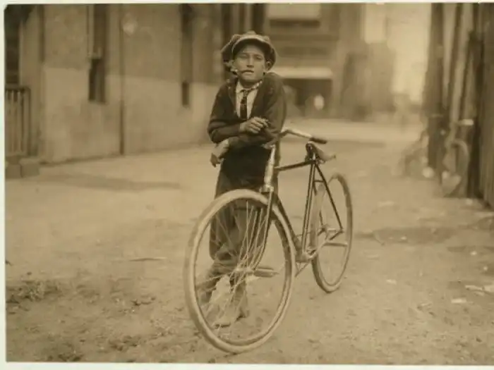 Фотография посыльного в 1910-х годах. Обратите внимание, на улицах еще нет тротуаров.