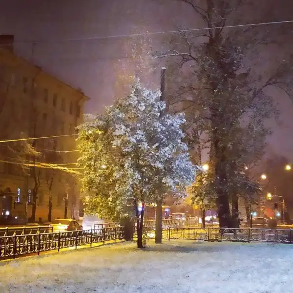 В Северной столице выпал первый снег. Еще вчера весь город был завален желтыми листьями, а сегодня все играют в снежки и лепят снеговиков.