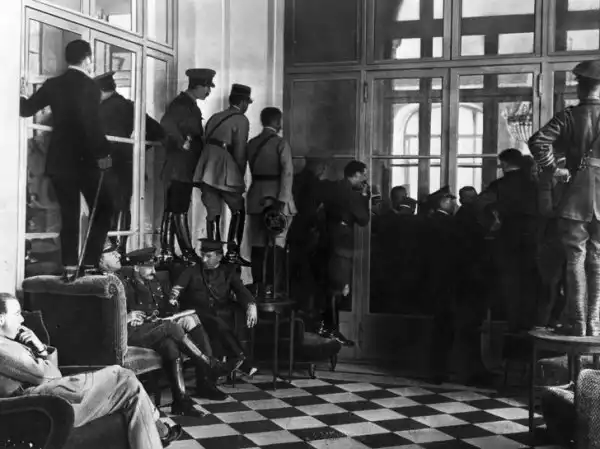 17. Офицеры стоят на стульях и столах, заглядывая в Зеркальную галерею, где вот-вот должны подписать Версальский мирный договор, 1919 год