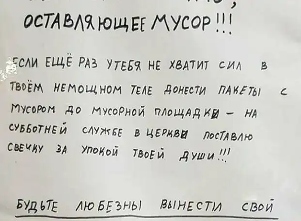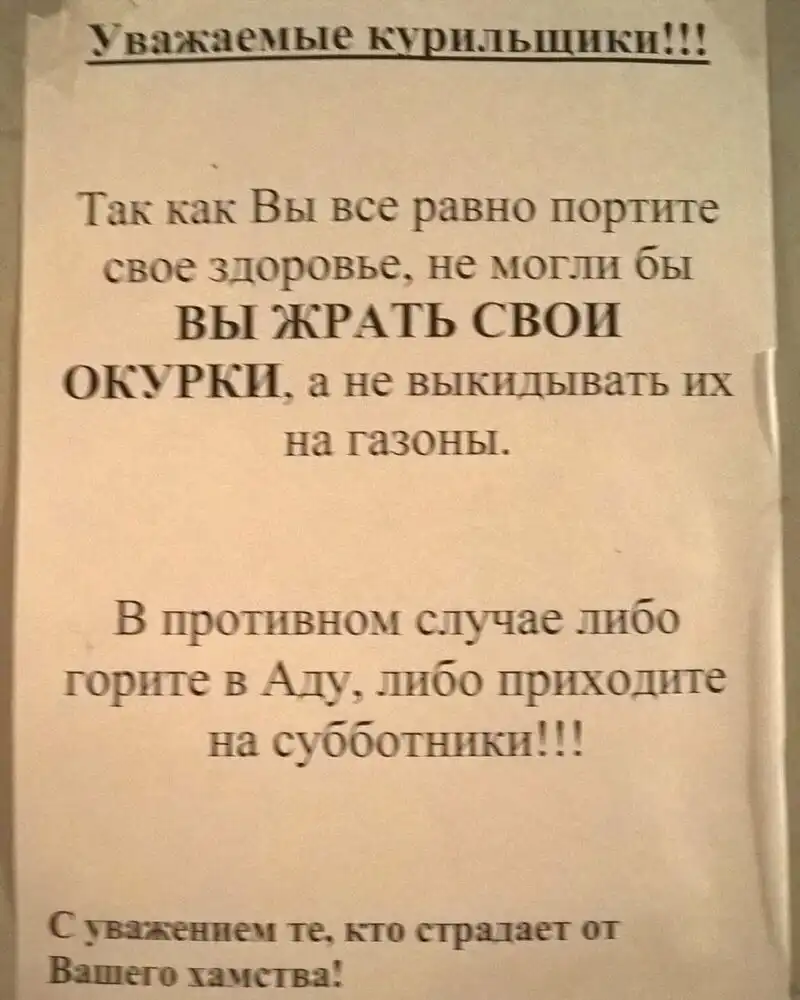 Но, к сожалению, хамы, нахалы и быдло на все и на всех плюют, а воспитанные люди продолжают страдать от своих соседей.