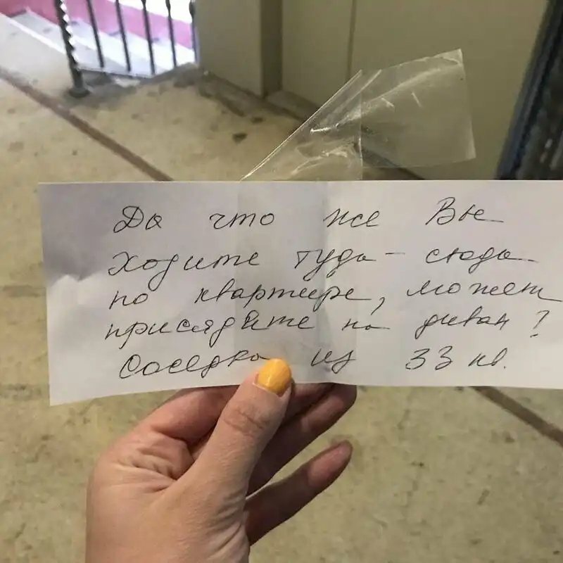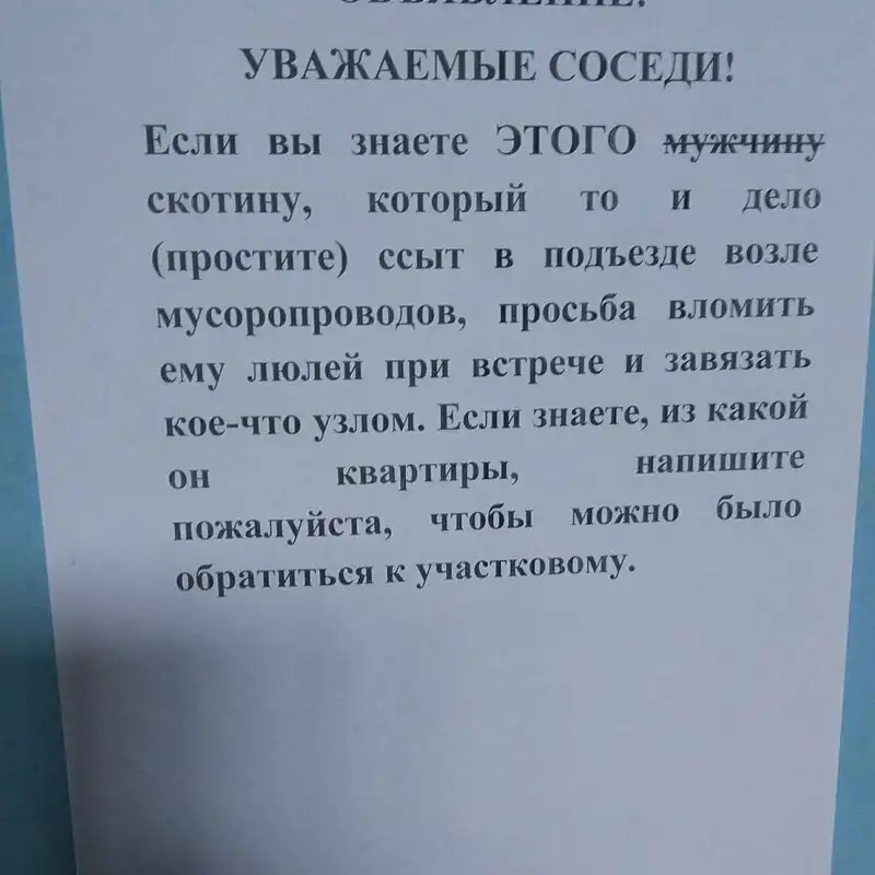 У вас хорошие соседи - значит вам повезло и никогда ни на что не жалуйтесь, потому что, чтобы у вас не случилось, вам все равно не так плохо как тем людям, у которых душа кричит, а сделать они могут только одно - написать записку, повесить ее в подъезде и надеяться, что, может быть, все-таки, кто-то прислушается к крику души.