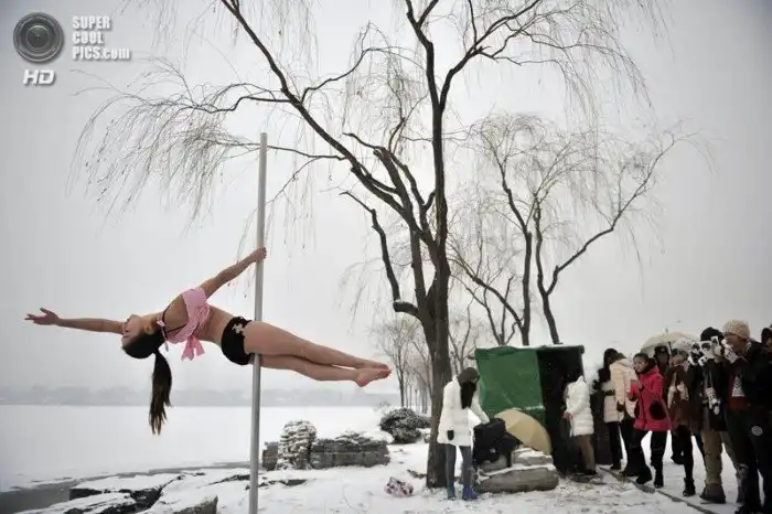Китай. Представительница национальной сборной по шестовой акробатике выступает в мороз, чтобы донести до общественности мысль, что шестовую акробатику не нужно приравнивать к стриптизу.