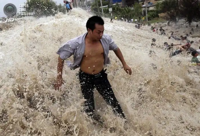 Китай. Люди собрались посмотреть и сфоткать приливную волну на реке Цяньтан,