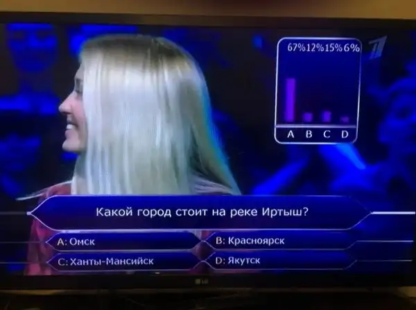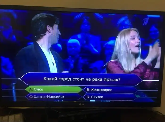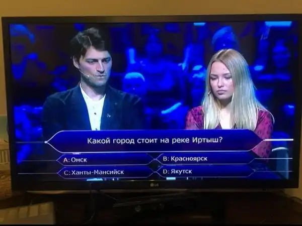 9 ноября в эфире вышел очередной выпуск передачи «Кто хочет стать миллионером?» В качестве игроков выступили театральные и киноактеры Аглая Шиловская и Иван Колесников. Один из вопросов звучал так: «Какой город стоит на реке Иртыш?» Варианты ответа: Омск, Красноярск, Ханты-Мансийск, Якутск.