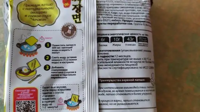 Как понятно из изображения на упаковке, нас ждет что очень сытное и корейское. По факту же не совсем так. В комплекте обычная по виду лапша (прямоугольный брусок) и внушительный пакет с соусом. Про премиум лапшу я не шучу — об этом даже на упаковке сзади написано. Кстати, в отличие от обычного бомж-пакета, эту лапшу надо отдельно варить 5 минут. У меня даже жена спросила: что ты делаешь, зачем? Почему тупо не залить водой? Потому что лапша все-таки другая (может толще, может, сорт другой, хз)— она тупо не успеет завариться.