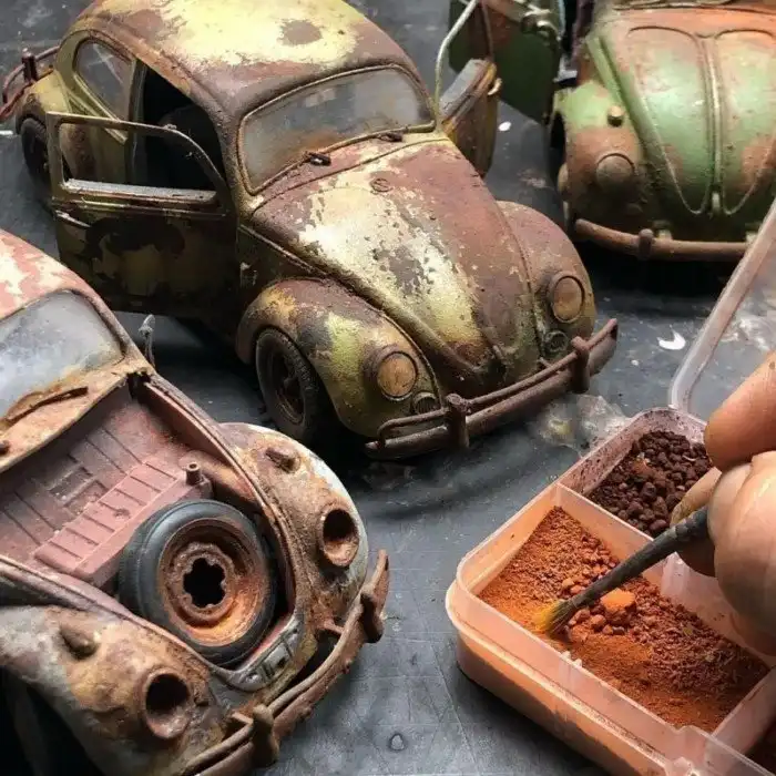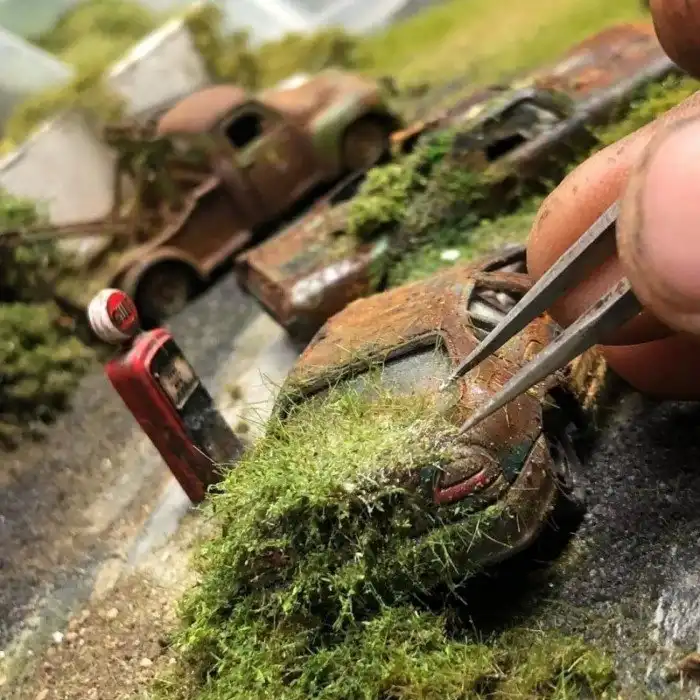 Создавать такие реалистичные сценки Эдди помогает, как сейчас говорят, богатый бэкграунд: когда-то он много занимался живописью, а его первым бизнесом – еще до фотографии – была архитектурная фирма. Но ради своих диорам художник осваивает и весьма экстравагантные материалы, задействуя то, что оказалось под рукой в буквальном смысле. Например, фактуру ржавчины на кузовах автомобилей он имитирует при помощи обычного табачного пепла: на многих фотографиях Путера запечатлен со своей любимой трубкой, так что за материалами для работы ему далеко ходить не надо. В дело идут песок, глина, камни, сухие листья, проволока, вата, воск, эпоксидка и даже травы, которые можно найти на любой кухне – петрушка, базилик и прочие орегано с тимьяном.