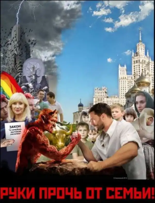 Как мы видим, Джейми противостоит Оксане Пушкиной, которая активно выступает за закон о домашнем насилии. А ее убеждения защищает сам дьявол, вступивший в схватку с актером. А для пущей выразительности на фоне Пушкиной развивается ЛГБТ-флаг и идол демона Бафомета.