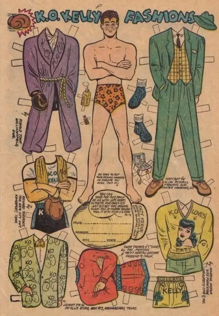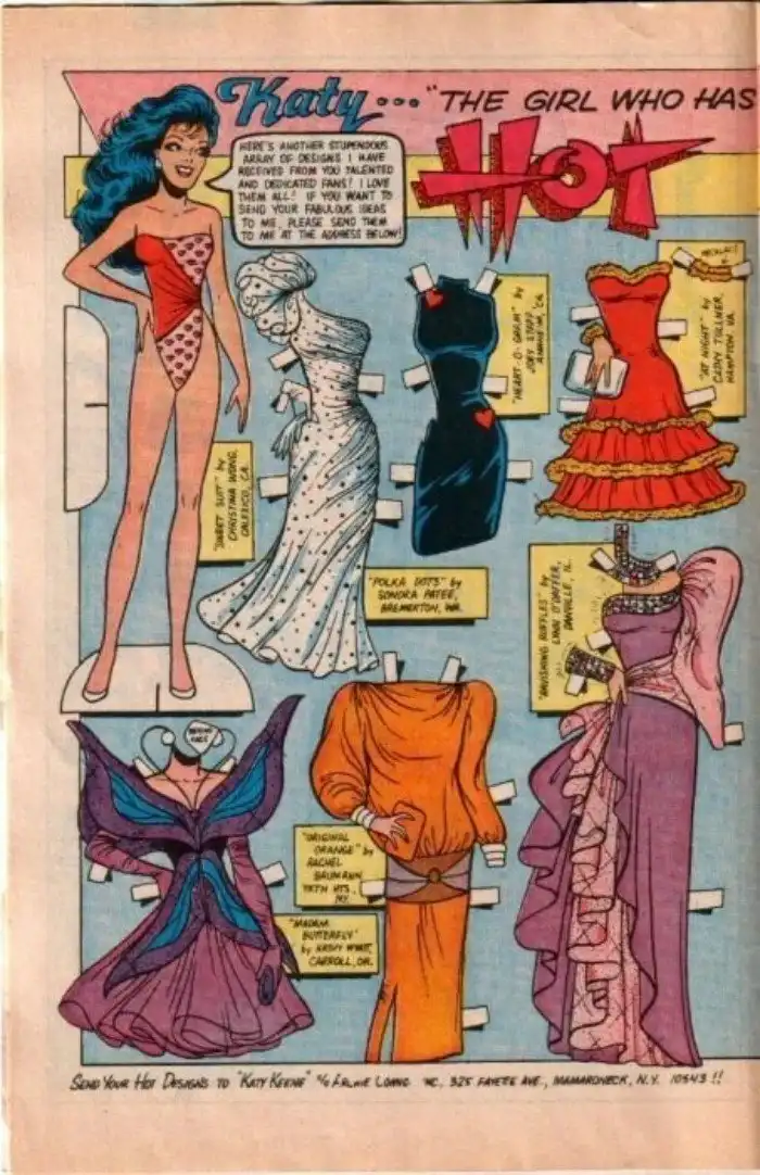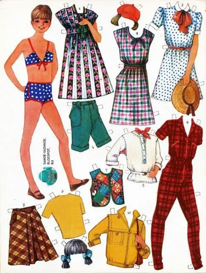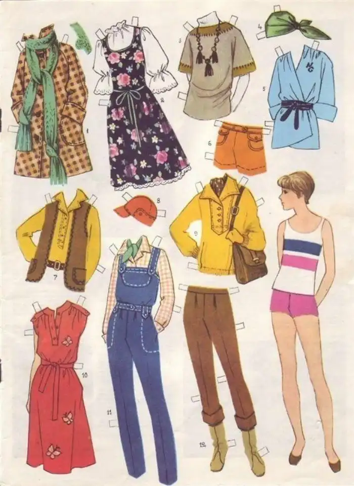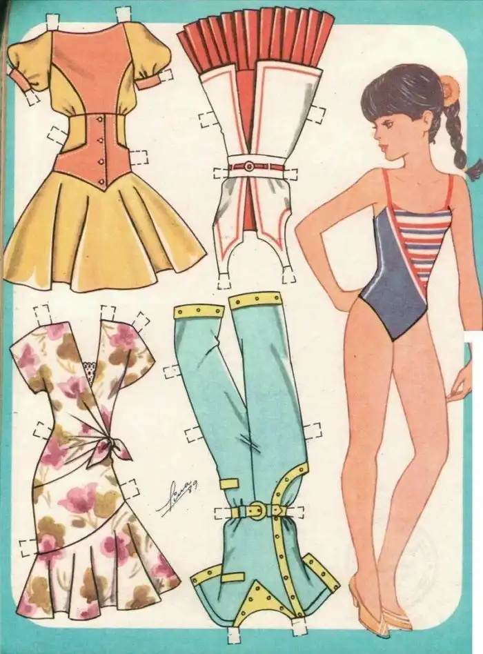 На самом деле все очень просто, для тех кто не в курсе - одежда рисовалась со специальными "плечиками" которые следовало загнуть за плечи фигурки и вот она уже в платье или костюме