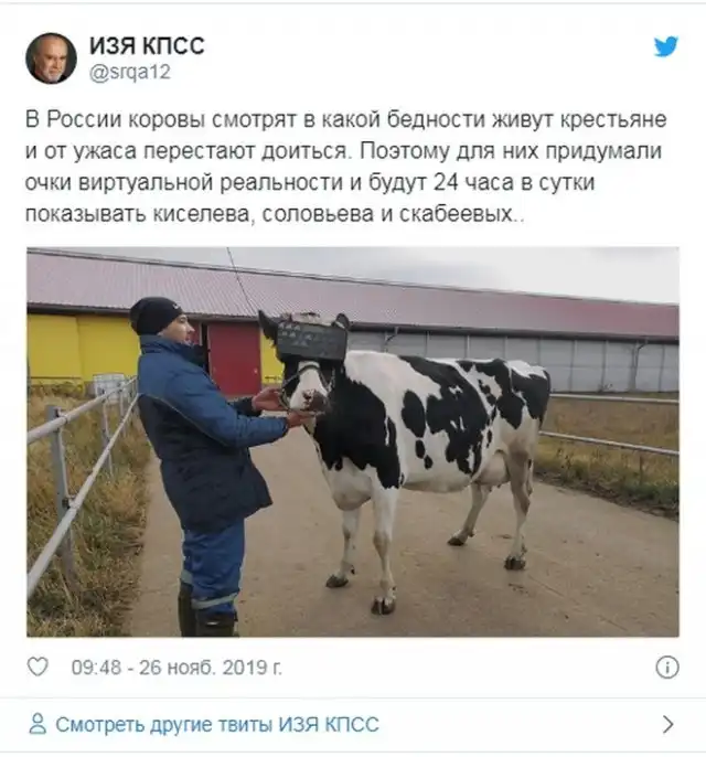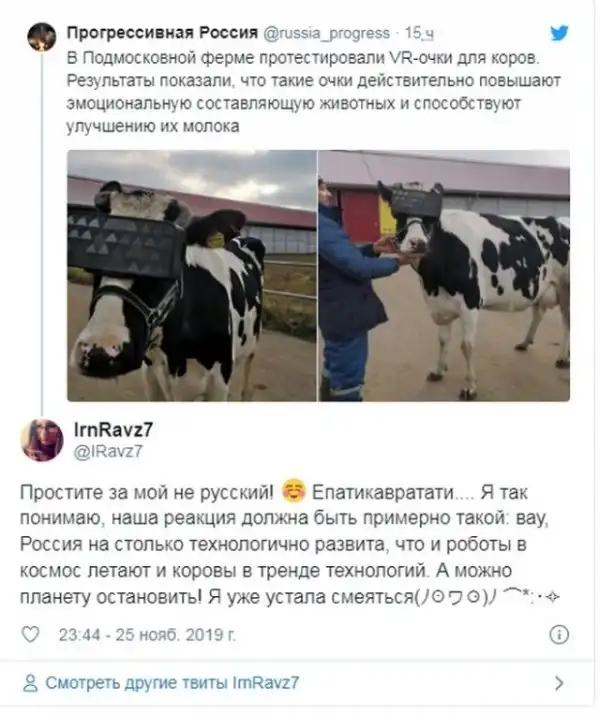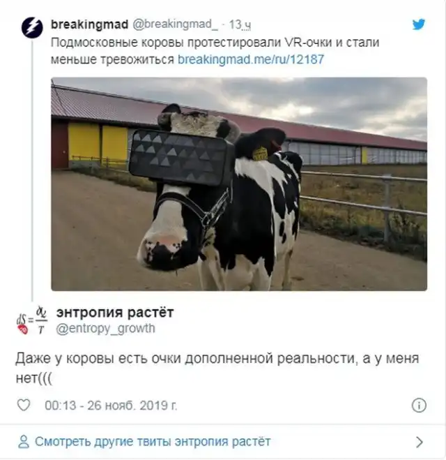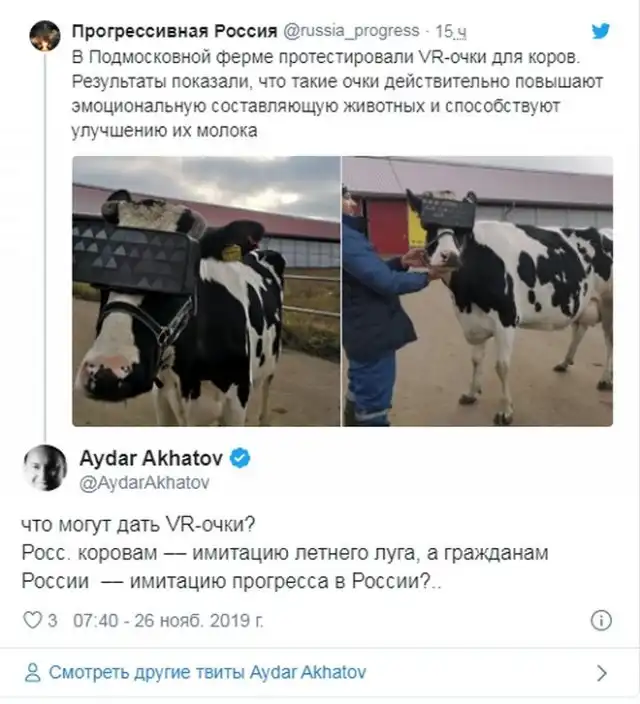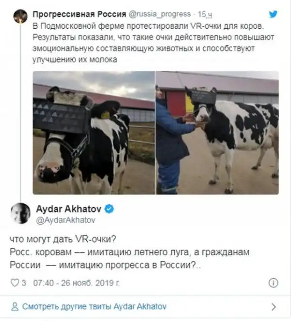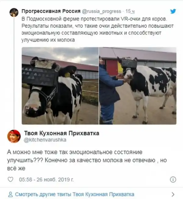 Необычным способом решено было поднять настроение коровам с одной из Подмосковных ферм — фермеры, кстати, уже заявили, что коровы действительно стали более счастливыми. А пользователи в Сети уже начали «завидовать» животным и поражаться техническому прогрессу в России. Что в виртуальной реальности смотрели животные — читайте далее.