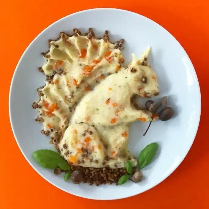 26. Счастливая белка (картофельное пюре с луком, морковью и чечевицей; приправить мускатным орехом, базиликом, перцем и солью)
