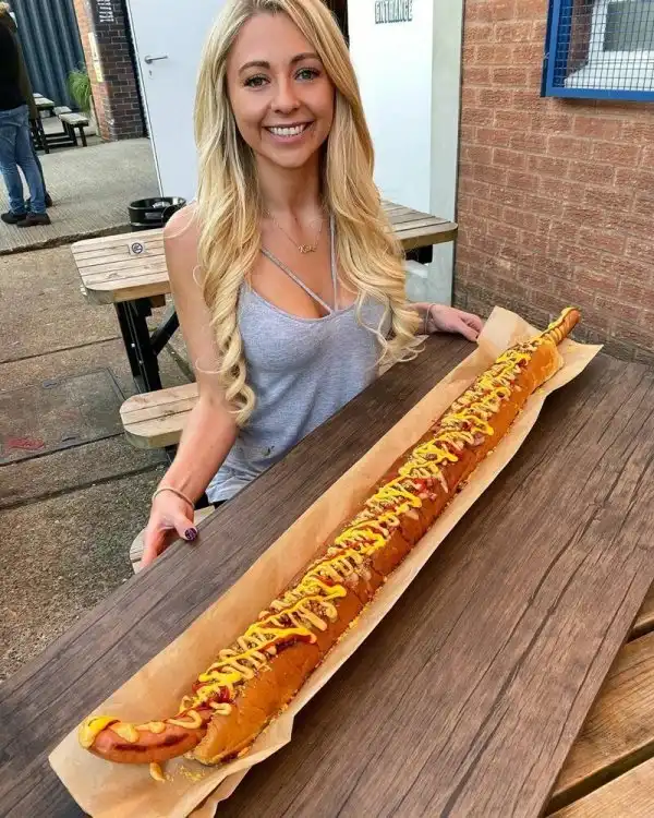 Если посмотреть на эту девушку в первый раз, то даже в голову не придет мысль о том, на что она способна. Представляем вам 25-летнюю Кейт Овенс из Великобритании, которая умудрилась съесть хот-дог в 5 000 калорий всего за 25 минут. Длина блюда составляла один метр, а на стол его выносили сразу два официанта. Общий вес хот-дога с сыром, майонезом, кетчупом, горчицей, беконом и сосиской достигал отметки в 2,5 кг.