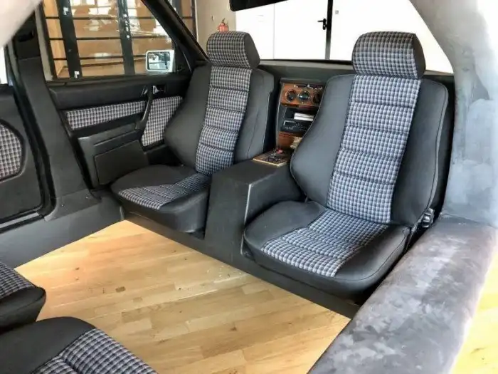 Как можно заметить на снимка, Mercedes-Benz 190, ставший переговоркой в офисе Antoni, лишился пола (это, очевидно, сделало пространство более удобным); кроме того, передние сиденья «повернули» лицом к задним. Среди прочего, машину лишили педалей и руля — опять же, для удобства.