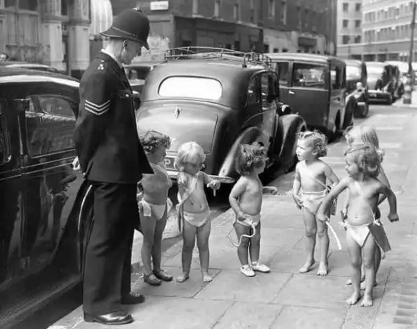 1947 год. Сержант полиции стоит рядом с шестью маленькими девочками, одетыми ангелами, возле Saville Theatre в Лондоне, где они принимают участие в утреннике, организованном в помощь Детской лиге жалости (Children’s League of Pity)