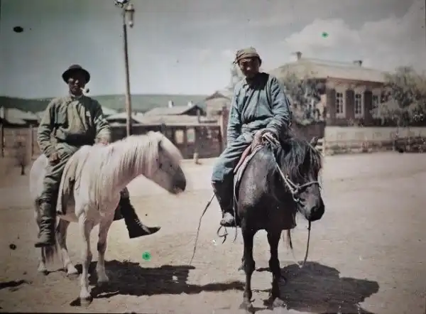 Два всадника-бурята в Троицкосавске, уездном городе Забайкальской области в 4 верстах от китайской границы. Автохромное фото французского фотографа Стефана Пассе, 1913