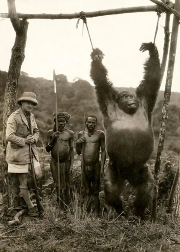 Итальянский путешественник Аттилио Гатти с двумя нанятыми пигмеями и пойманной ими гориллой в Бельгийском Конго, 1930 год