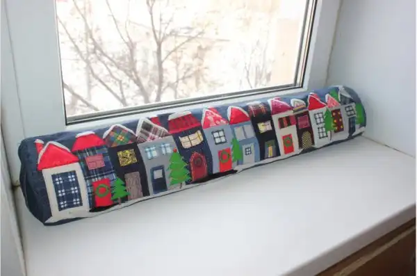 Подушка-валик из старых джинсов и лоскутков ткани
