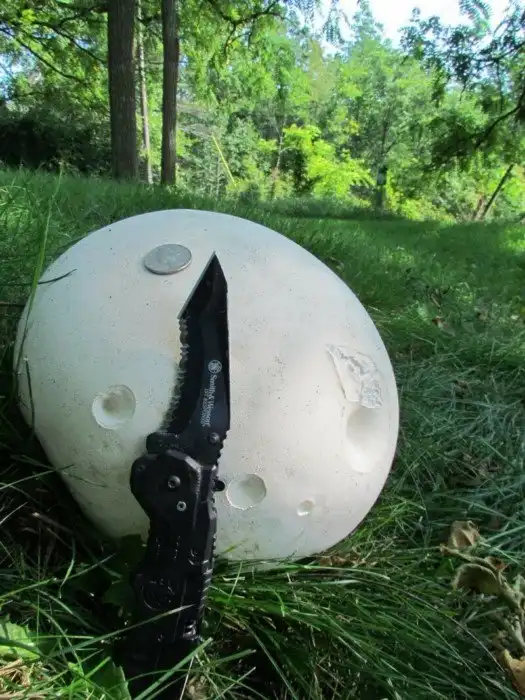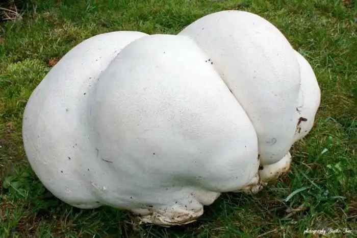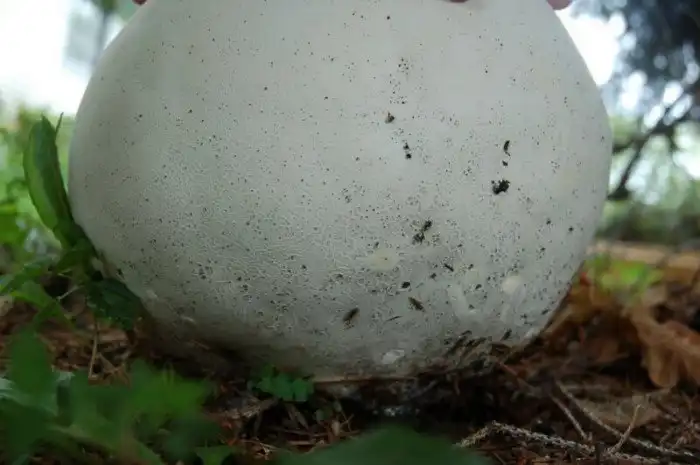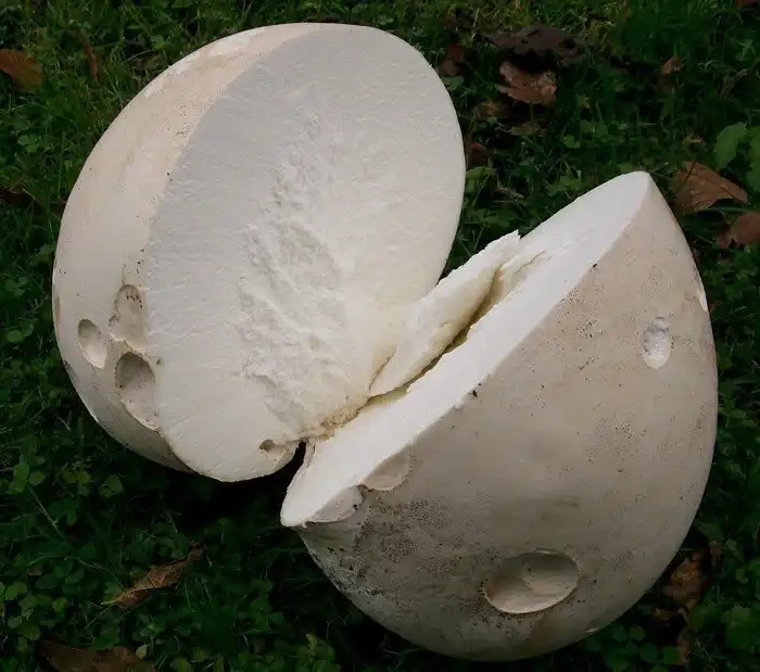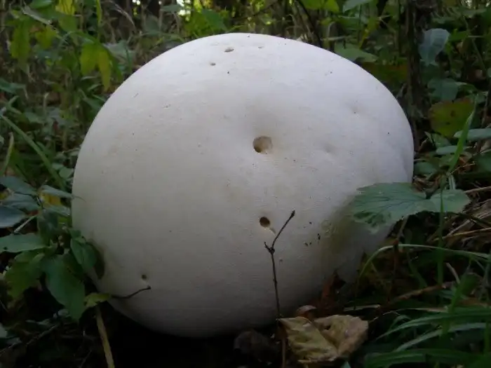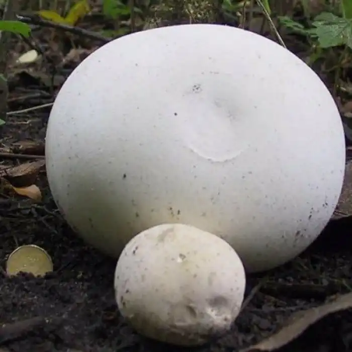 Лангерманнию гигантскую трудно спутать с другими грибами, а если точнее, то невозможно. Ее шаровидное плодовое тело напоминает огромный белый мяч, диаметр которого может достигать 50 сантиметров.