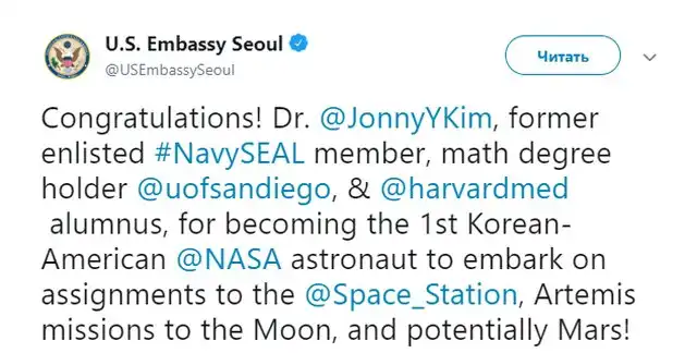 Перевод: Поздравляем! Джонни Ким, бывший «морской котик», выпускник университета Сан-Диего и Медицинской школы Гарварда, стал первым американо-корейским астронавтом NASA, готовым отправиться на МКС, Луну и, возможно, на Марс!