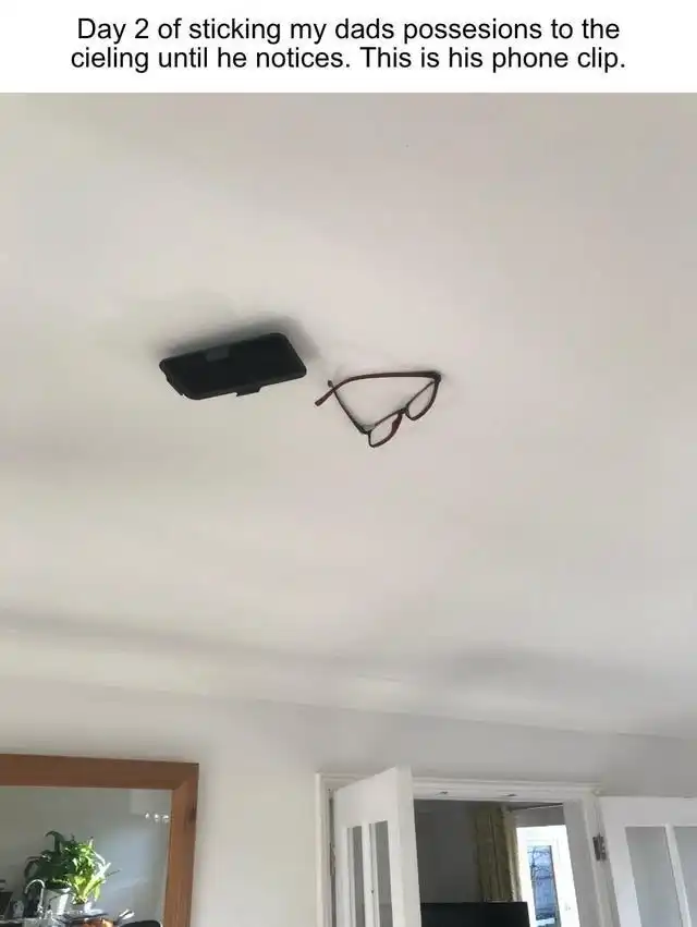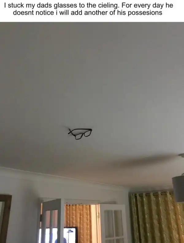 Я приклеил очки папы к потолку. Каждый день, пока он этого не замечает, я буду добавлять туда что-то из его вещей.
