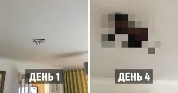 Шел второй день эксперимента - на потолке оказался папин чехол от телефона.