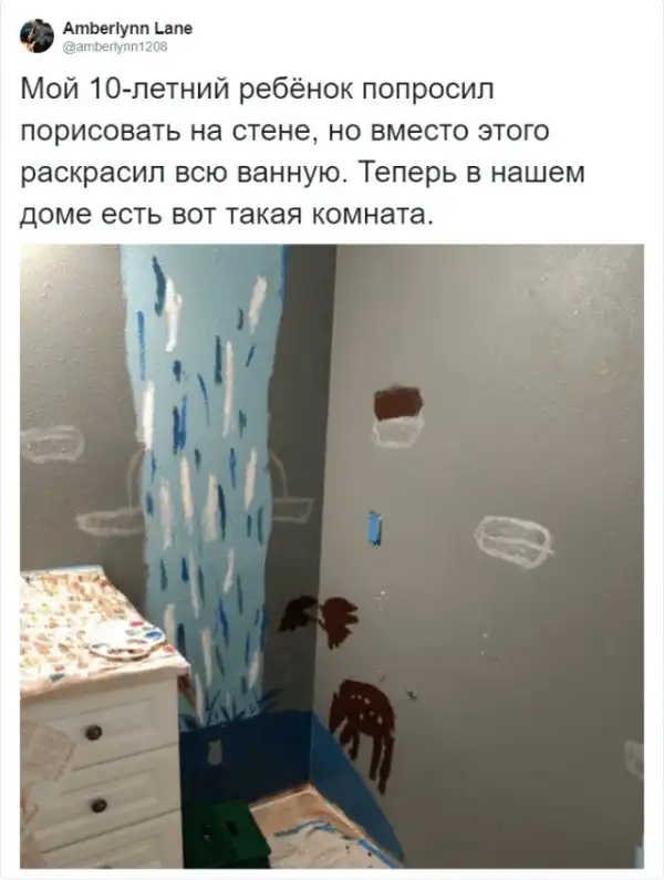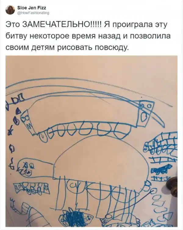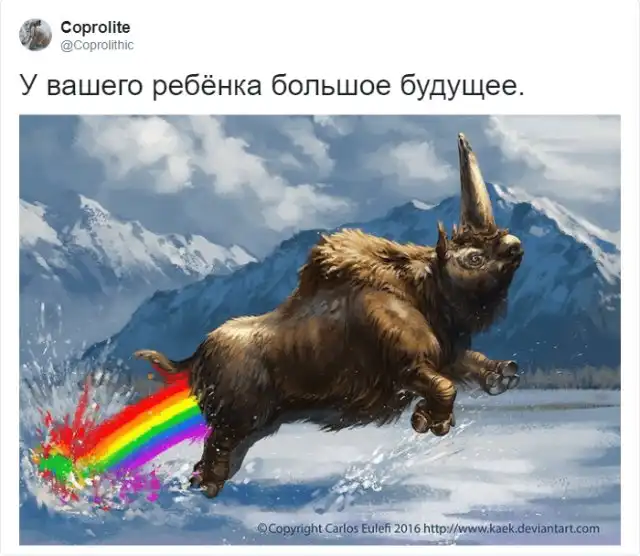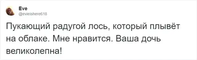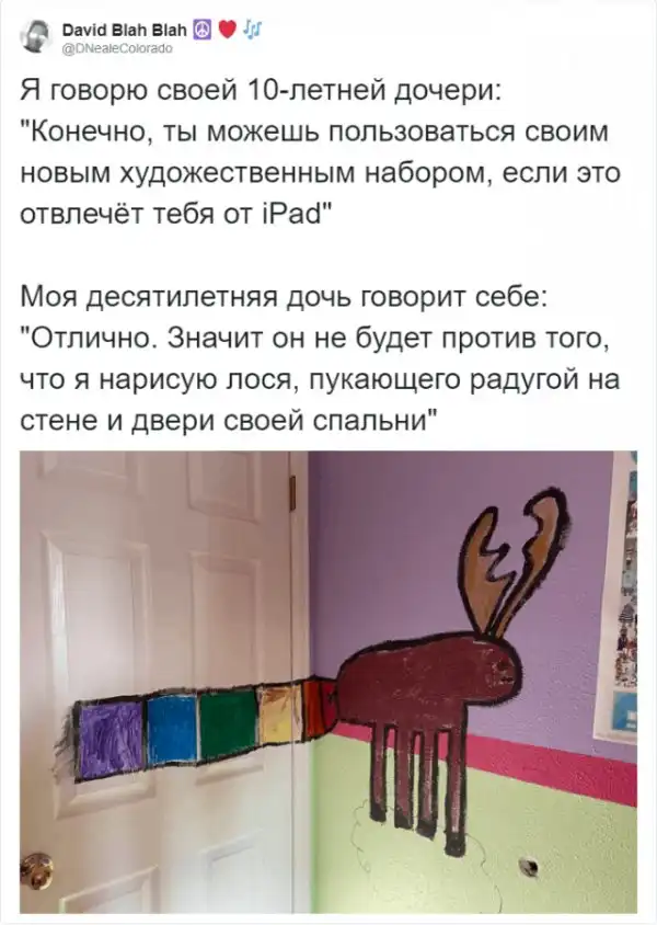 Дочурка выполнила обещание и изобразила... пукающего радугой лося. Но вместо того, чтобы отругать ее, отец решил запечатлеть это произведение искусства и опубликовать пост в Твиттере. "Радужный лось" был обречен на успех и народ оказался в полном восторге. Пост более 40 тысяч ретвитов и более 280 тысяч лайков. Пользователи решили устроить небольшой тред в комментариях и поделиться художествами своих детей.