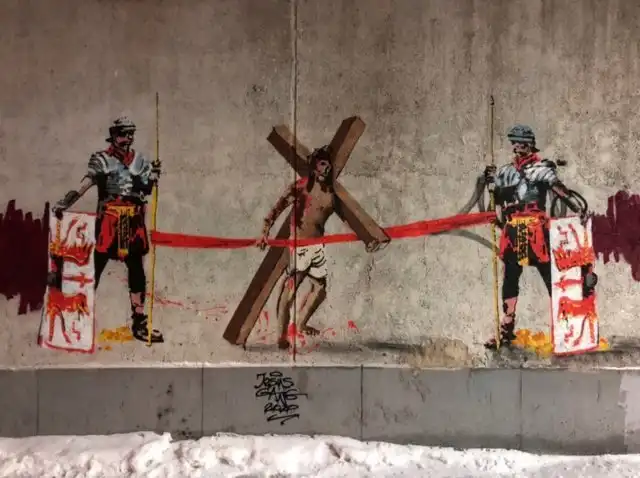 На стене кинотеатра "Салют" появилось граффити с Иисусом и крестом на плечах, который пересекает финишную ленту. Ее держат два римских легионера на пилумах, пишет Telegram-канал Street Art Hunter. Отметим, что граффити изображает сюжет "Крестный путь Иисуса Христа" из Нового Завета.