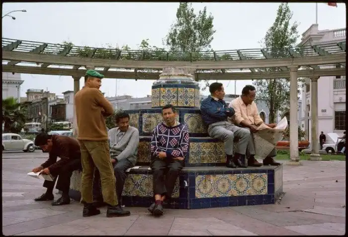 Лима. Мужчины, сидящие на фонтане, Перу, 1974