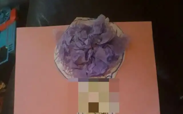 Девочка явно старалась, но взрослым снова что-то мерещится. У основания виднеются два листа, а сам фиолетовый цветок выполнен из папиросной бумаги. Мама, посмеявшись над своими ассоциациями, все же отдала подарок учительницы — интересно, что увидела та.