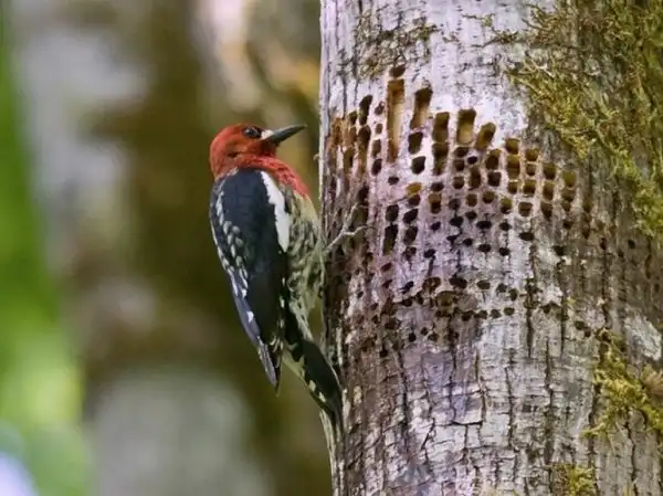 Это работа особого вида дятлов — дятла-сосуна. Он долбит дерево не в поисках жуков или личинок, а чтобы добраться до древесного сока.